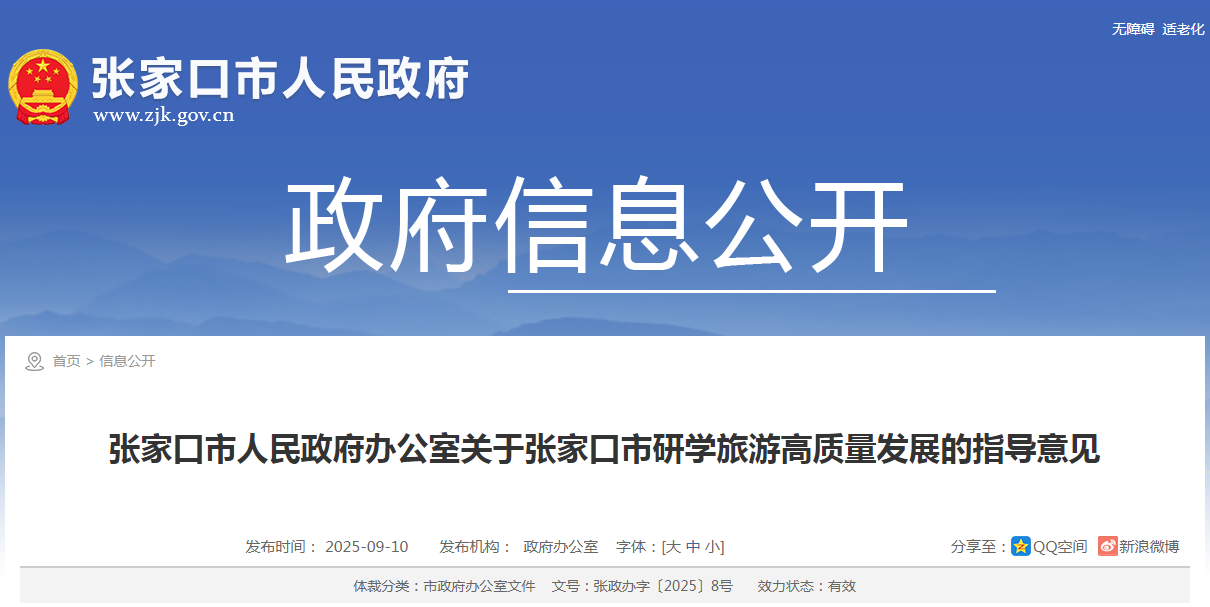 《张家口市研学旅游高质量发展指导意见》自印发之日起施行,有效期5年。